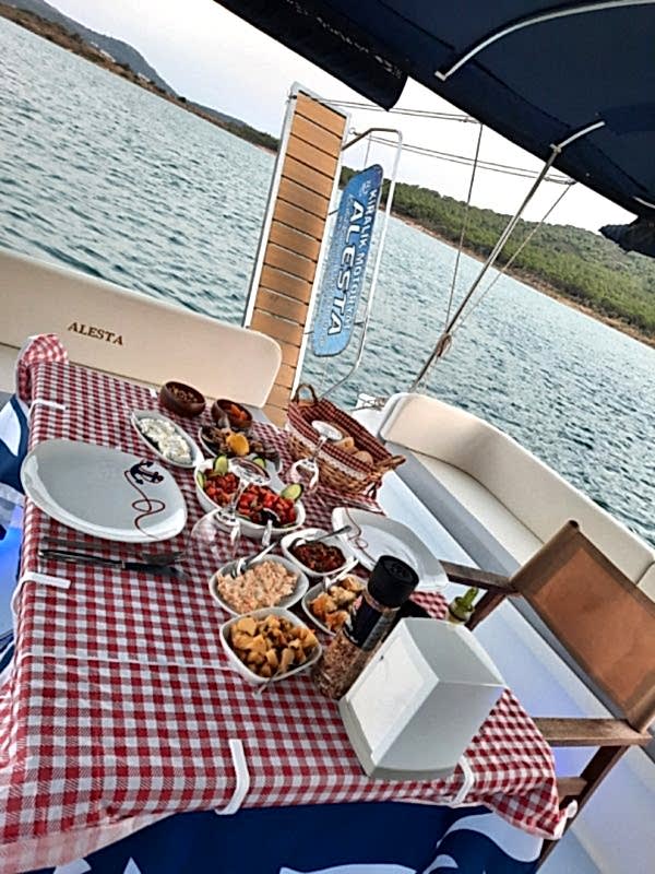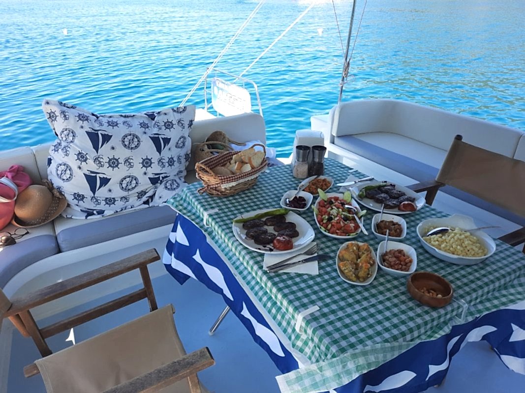 Aile işletmemiz ile verdiğimiz hizmet için dizayn edilmiş yatlarımızda mangalda çipura – levrek – köfte – tavuk ile birlikte Ayvalık’ ımızın taze sıkılmış zeytinyağı eşliğinde hazırladığımız salatalarımız ve ev yapımı günlük mezelerimizi sunuyoruz.